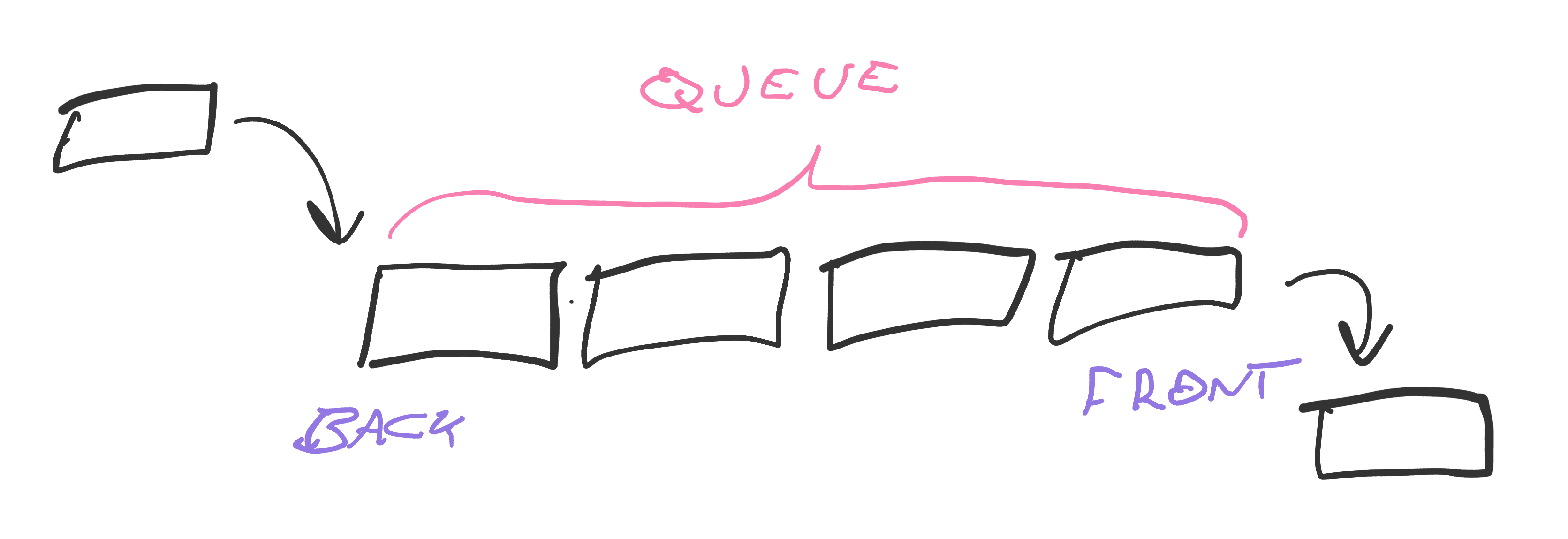 enqueing adds items to the back of a queue, dequeing takes them out the front. Items in the middle wait their turn. Like a lunch-time burrito queue. First come first serve, FIFO for short (first in first out).
